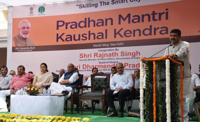 The Union Minister for Petroleum & Natural Gas and Skill Development & Entrepreneurship, Dharmendra Pradhan addressing at the inauguration of the Pradhan Mantri Kaushal Kendra, at Mandir Marg, in New Delhi on October 23, 2017. The Union Home Minister, Rajnath Singh and other dignitaries are also seen.