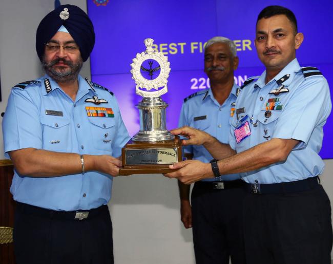 The Chief of the Air Staff, Air Chief Marshal B.S. Dhanoa presenting the Best Overall Performance “Fighter Squadron†Trophy to the Air Officer Commanding, Air Force Station Halwara, Air Commodore D.V. Khot, during the WAC Station Commanders’ Conference: 2017, at HQ Western Air Command, in New Delhi on October 23, 2017.