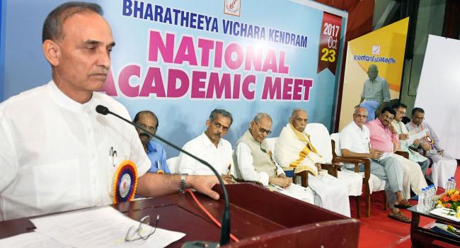 The Minister of State for Human Resource Development and Water Resources, River Development and Ganga Rejuvenation, Dr. Satya Pal Singh addressing the gathering after inaugurating the National Academic Meet, organised by Bharatheeya Vichara Kendra, in Thiruvananthapuram on October 23, 2017. The Director Bharatheeya Vichara Kendra, P. Parameswaran and other dignitaries are also seen.