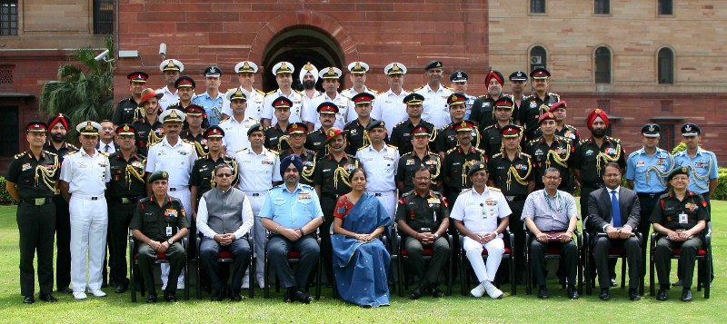 The Union Minister for Defence, Nirmala Sitharaman in a group photograph at the Defence Attaches Conclave, in New Delhi on April 09, 2018. The Chief of the Air Staff, Air Chief Marshal B.S. Dhanoa, the Vice Chief of the Army Staff, Lieutenant General Sarath Chand, the Vice Chief of the Naval Staff Vice Admiral Ajit Kumar P. and the Defence Secretary, Sanjay Mitra are also seen.
