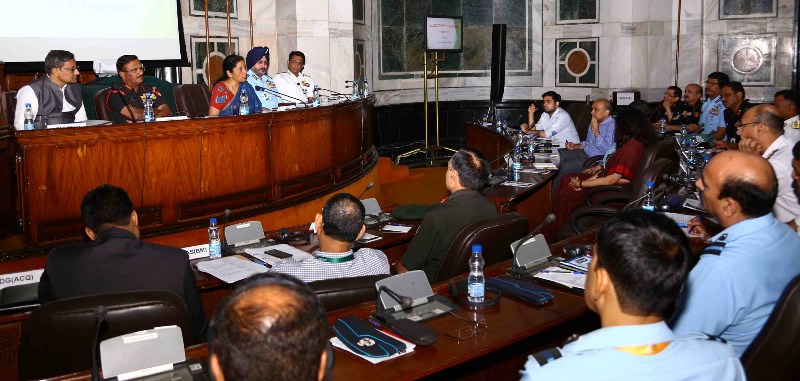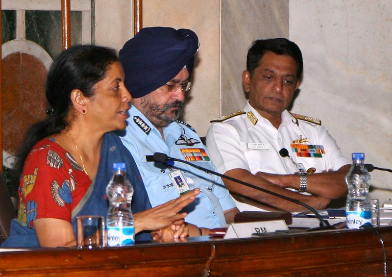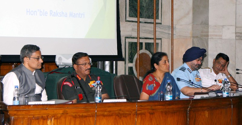 The Union Minister for Defence, Nirmala Sitharaman chairing the Defence Attaches Conclave, in New Delhi on April 09, 2018. The Chief of the Air Staff, Air Chief Marshal B.S. Dhanoa, the Vice Chief of the Army Staff, Lieutenant General Sarath Chand, the Vice Chief of the Naval Staff Vice Admiral Ajit Kumar P. and the Defence Secretary, Sanjay Mitra are also seen.