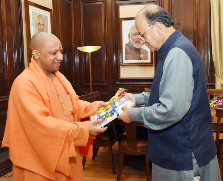 The Chief Minister of Uttar Pradesh, Yogi Adityanath calling on the Union Minister for Finance and Corporate Affairs, Arun Jaitley, in New Delhi on February 02, 2018.