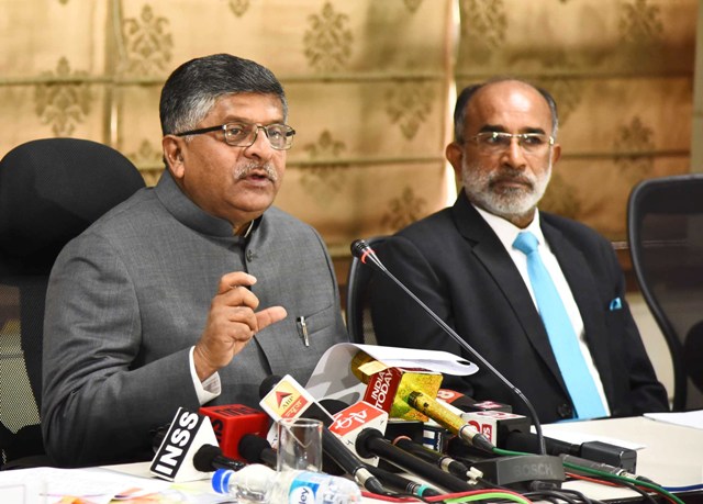 The Union Minister for Electronics & Information Technology and Law & Justice, Ravi Shankar Prasad addressing a press conference on the progress made in the implementation of BPO promotion scheme, in New Delhi on December 13, 2017. The Minister of State for Tourism (I/C) and Electronics & Information Technology, Alphons Kannanthanam is also seen.
