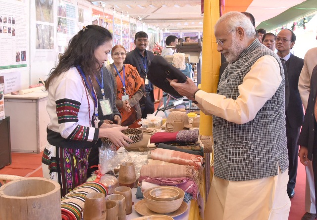 The Prime Minister, Narendra Modi walks through the exhibition of farm produce of North-East and display of relevant farm and non-farm technologies, at Assam Rifles Cant, Aizawl on December 16, 2017.