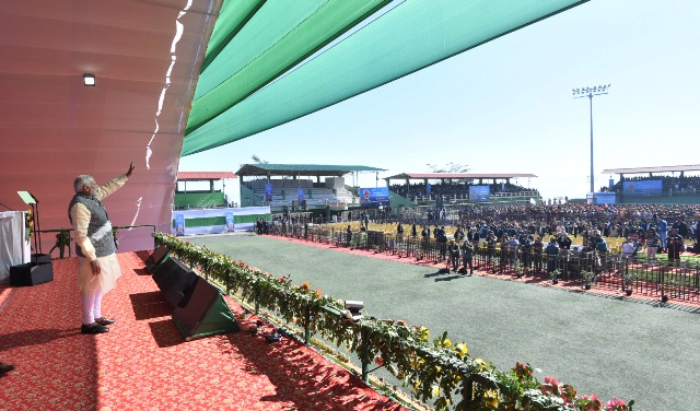 The Prime Minister, Narendra Modi addressing the gathering at the ceremony to dedicate the Tuirial Hydro Electric Power Project to the Nation, at Assam Rifles Cant, Aizawl on December 16, 2017.