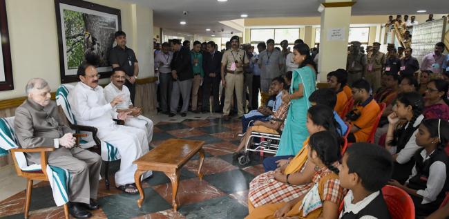 The Vice President, M. Venkaiah Naidu interacting with differently abled children and Special Educators from Centre for Empowerment & Enrichment, in Kochi, Kerala on November 21, 2017. The Governor of Kerala, P. Sathasivam and the Minister for Local Self-Governments, Welfare of Minorities, Wakf and Haj, Kerala, Dr. K.T. Jaleel are also seen.