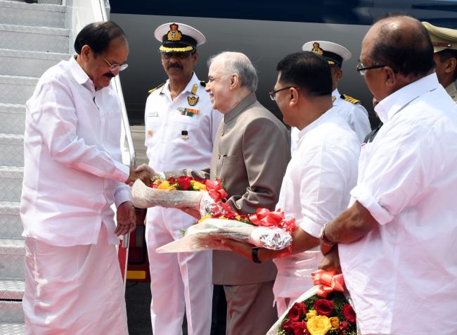 The Vice President, M. Venkaiah Naidu being received by the Governor of Kerala, P. Sathasivam, on his arrival, in Kochi, Kerala on November 21, 2017. The Minister for Local Self-Governments, Welfare of Minorities, Wakf and Haj, Kerala, Dr. K.T. Jaleel is also seen.