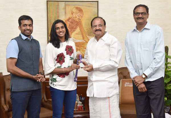 The Badminton PlayerP.VSindhu and the coach,P.Gopichand calling on the Vice President,M.Venkaiah Naidu, in New Delhi on August, 31, 2017.