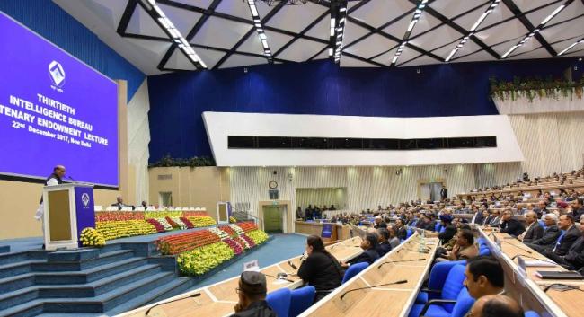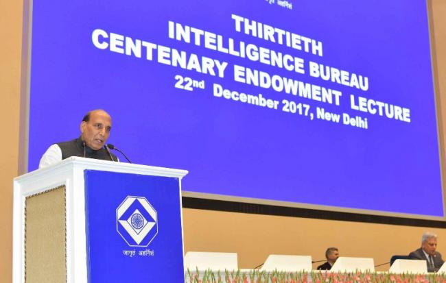 The Union Home Minister, Rajnath Singh delivering the 30th Intelligence Bureau (IB) Centenary Endowment Lecture, in New Delhi on December 22, 2017.