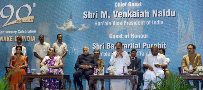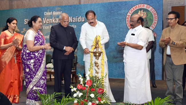 The Vice President, M. Venkaiah Naidu at the 90th anniversary celebration of Andhra Chamber of Commerce, in Chennai on October 17, 2017. The Governor of Tamil Nadu, Banwarilal Purohit and the Minister for Fisheries, Personnel and Administrative Reforms, Tamil Nadu, D. Jayakumar are also seen.