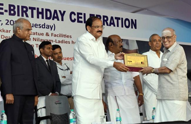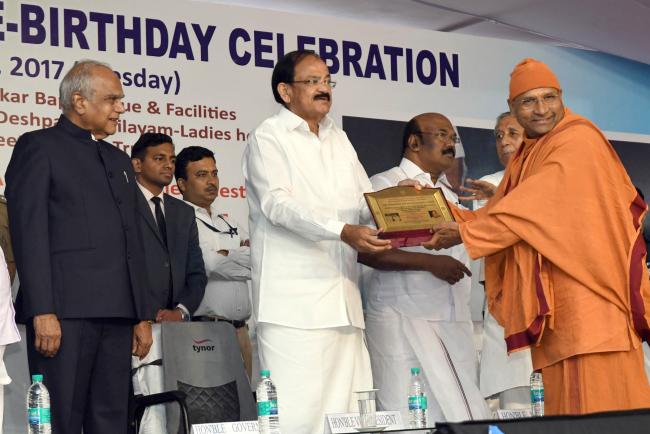 The Vice President, M. Venkaiah Naidu giving away awards for the best service at an event to rededicate Thakkar Bapa Vidyalaya, unveiling the renovated Statue of Thakkar Bapa and unveil the plaque for pile foundation of Didi Nirmala Deshpande Nilayam, in Chennai on October 17, 2017. The Governor of Tamil Nadu, Banwarilal Purohit and the Minister for Fisheries, Personnel and Administrative Reforms, Tamil Nadu, D. Jayakumar are also seen.