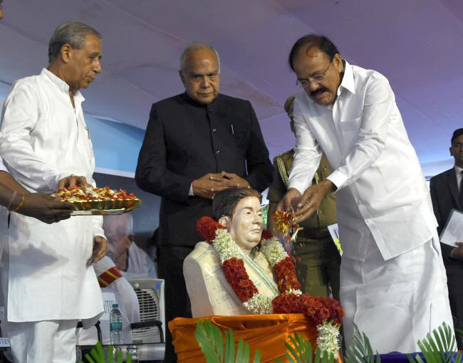 The Vice President, M. Venkaiah Naidu paying floral tributes to Didi Nirmala Deshpande at an event to rededicate Thakkar Bapa Vidyalaya, unveiling the renovated Statue of Thakkar Bapa and unveil the plaque for pile foundation of Didi Nirmala Deshpande Nilayam, in Chennai on October 17, 2017. The Governor of Tamil Nadu, Banwarilal Purohit is also seen.