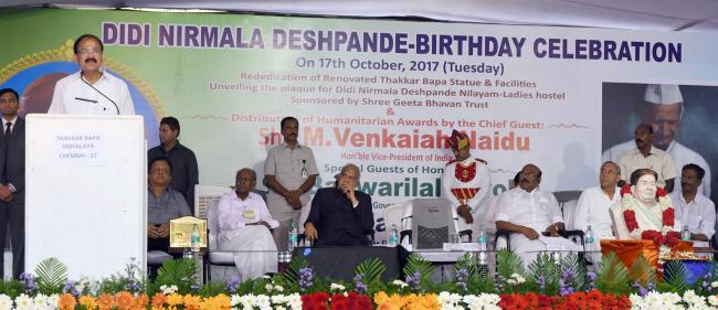 The Vice President, M. Venkaiah Naidu addressing the gathering after rededicating Thakkar Bapa Vidyalaya, unveiling the renovated Statue of Thakkar Bapa and unveil the plaque for pile foundation of Didi Nirmala Deshpande Nilayam, in Chennai on October 17, 2017. The Governor of Tamil Nadu,Banwarilal Purohit and the Minister for Fisheries, Personnel and Administrative Reforms, Tamil Nadu,D. Jayakumar are also seen.