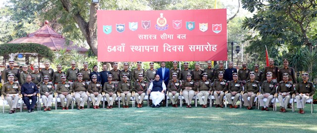 The Union Home Minister, Rajnath Singh in a group photograph during the 54th Anniversary Parade of the Sashastra Seema Bal (SSB), in New Delhi on December 23, 2017. The Director General, SSB, Rajni Kant Mishra is also seen.