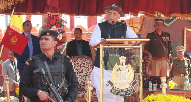 The Union Home Minister, Rajnath Singh addressing the 54th Anniversary Parade of the Sashastra Seema Bal (SSB), in New Delhi on December 23, 2017. The Director General, SSB, Rajni Kant Mishra is also seen.