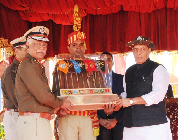 The Union Home Minister, Rajnath Singh being presented a memento by the Director General, SSB, Rajni Kant Mishra, during the 54th Anniversary Parade of the Sashastra Seema Bal (SSB), in New Delhi on December 23, 2017
