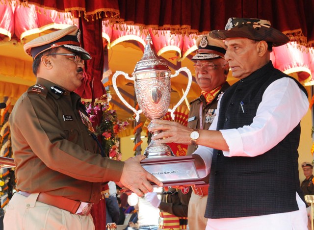 The Union Home Minister, Rajnath Singh presenting awards and trophies, during the 54th Anniversary Parade of the Sashastra Seema Bal (SSB), in New Delhi on December 23, 2017. The Director General, SSB, Rajni Kant Mishra is also seen.