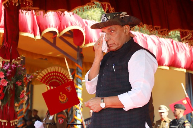 The Union Home Minister, Rajnath Singh holding back tears after presenting the President’s Police Medal for Gallantry (Posthumously) to Late CT/GD Sanjeet Kumar, received by his wife Manu Sharma, during the 54th Anniversary Parade of the Sashastra Seema Bal (SSB), in New Delhi on December 23, 2017.