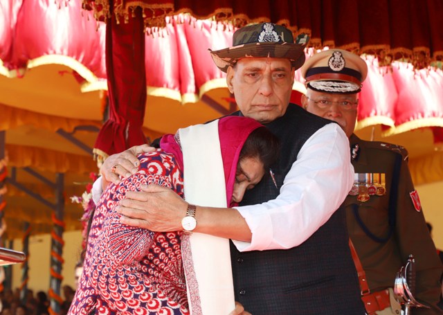The Union Home Minister, Rajnath Singh consoling Manu Sharma, wife of Late CT/GD Sanjeet Kumar, after presenting him with the President’s Police Medal for Gallantry (Posthumously), during the 54th Anniversary Parade of the Sashastra Seema Bal (SSB), in New Delhi on December 23, 2017. The Director General, SSB, Rajni Kant Mishra is also seen.
