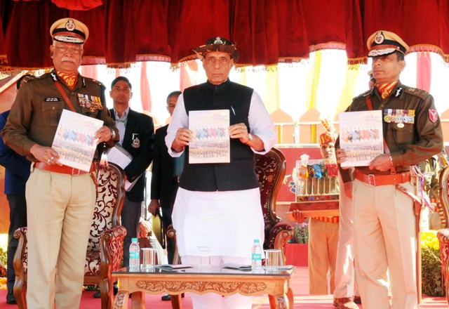 The Union Home Minister, Rajnath Singh releasing the Souvenir during the 54th Anniversary Parade of the Sashastra Seema Bal (SSB), in New Delhi on December 23, 2017. The Director General, SSB, Rajni Kant Mishra is also seen.