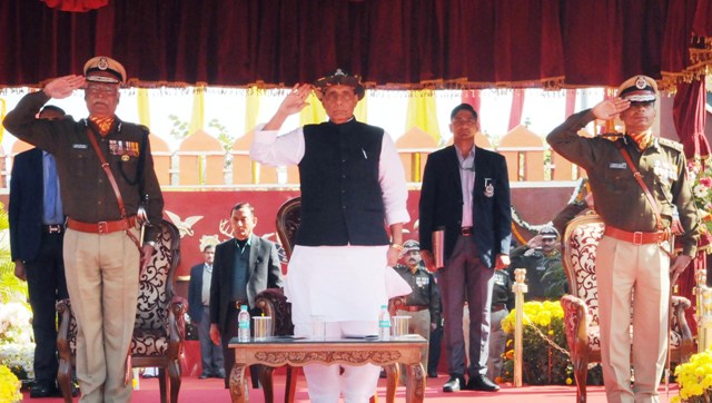 The Union Home Minister, Rajnath Singh taking the salute during the 54th Anniversary Parade of the Sashastra Seema Bal (SSB), in New Delhi on December 23, 2017. The Director General, SSB, Rajni Kant Mishra is also seen.