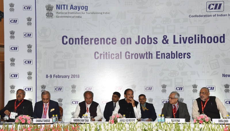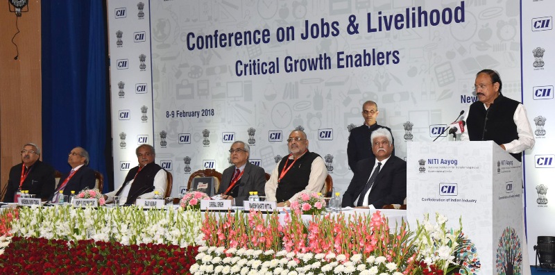 The Vice President, M. Venkaiah Naidu addressing the Conference on Jobs & Livelihood Creation - Critical Growth Enablers, organised by the NITI Aayog and the CII, in New Delhi on February 08, 2018.