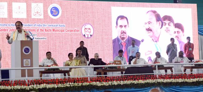 The Vice President, M. Venkaiah Naidu addressing the gathering after inaugurating the Golden Jubilee Celebrations of Kochi Municipal Corporation, in Kochi, Kerala on November 22, 2017. The Governor of Kerala, P. Sathasivam, the Minister for Local Self-Governments, Welfare of Minorities, Wakf and Haj, Kerala, Dr. K.T. Jaleel and other dignitaries are also seen.