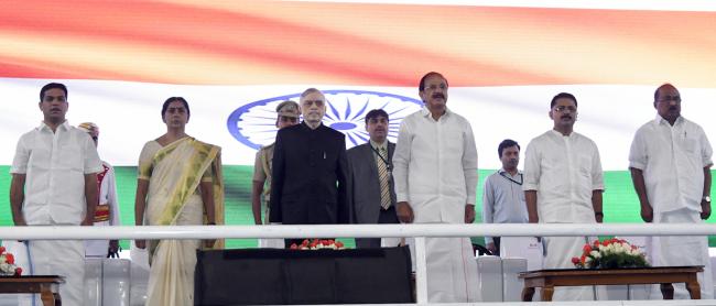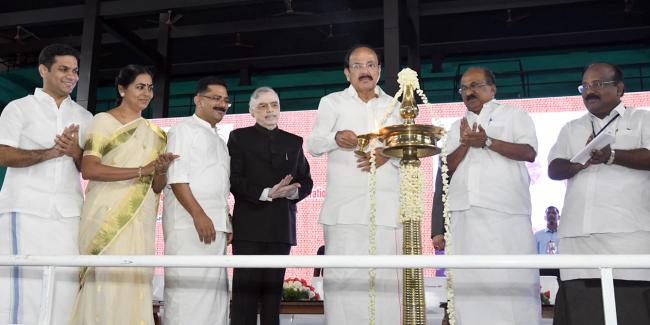 The Vice President, M. Venkaiah Naidu at an event to inaugurate the Golden Jubilee Celebrations of Kochi Municipal Corporation, in Kochi, Kerala on November 22, 2017. The Governor of Kerala, P. Sathasivam, the Minister for Local Self-Governments, Welfare of Minorities, Wakf and Haj, Kerala, Dr. K.T. Jaleel and other dignitaries are also seen.