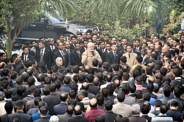The Prime Minister, Narendra Modi met and exchanged new year greetings with the PMO officials and SPG personnel, at Lok Kalyan Marg, in New Delhi on January 02, 2018.