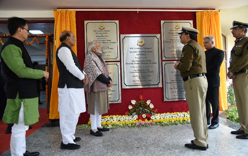 The Prime Minister, Narendra Modi unveiled the plaques to mark the inauguration of five new buildings at the BSF Academy, during the Annual Conference of DGPs and IGPs, at Tekanpur, Madhya Pradesh. on January 07, 2018. The Union Home Minister, Rajnath Singh and the Minister of State for Home Affairs, Kiren Rijiju are also seen.