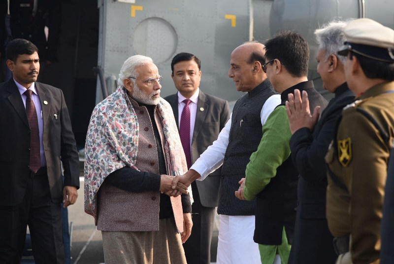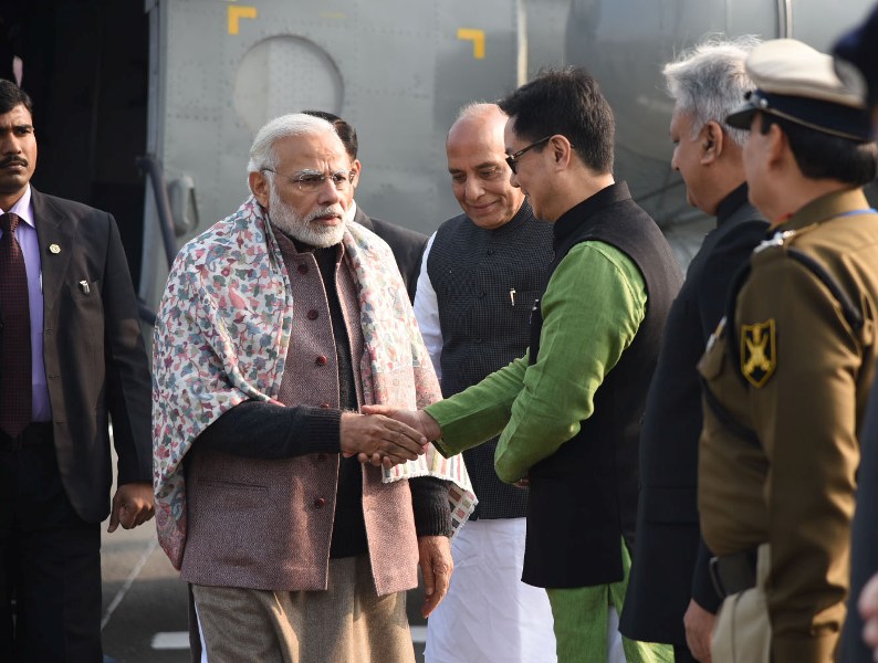 The Prime Minister, Narendra Modi at the Annual Conference of DGPs and IGPs at the BSF Academy, at Tekanpur, Madhya Pradesh on January 07, 2018. The Union Home Minister, Rajnath Singh and the Minister of State for Home Affairs, Kiren Rijiju are also seen.