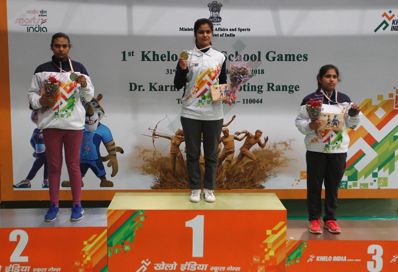 The Gold Medal Winner Manu Bhaker (Jhajjar), the Silver Medal Winner Anjali Choudhary (Karnal) and the Bronze Medal Winner Tanu Rawal (Karnal) in the 10M Air Pistol event for girls, at the 1st Khelo India School Games, in New Delhi on February 04, 2018.