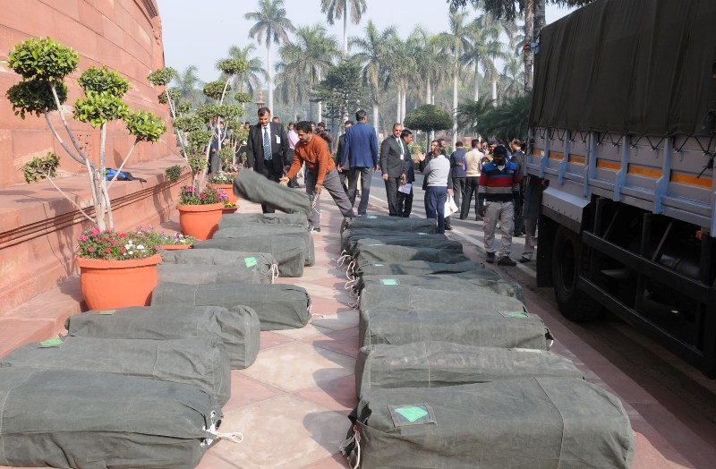 The General Budget 2018-19 documents brought in the Parliament House premises under security, in New Delhi on February 01, 2018.