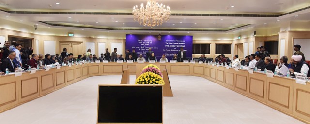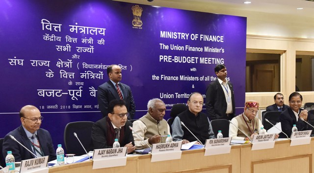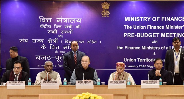 The Union Minister for Finance and Corporate Affairs, Arun Jaitley chairing the Pre-Budget Consultation with the States Finance Ministers in connection with the forthcoming Union Budget 2018-19, in New Delhi on January 18, 2018. The Minister of State for Finance, Shiv Pratap Shukla, the Minister of State for Finance and Shipping, P. Radhakrishnan, the Finance Secretary, Dr. Hasmukh Adhia and the Secretary, Department of Economic Affairs, S.C. Garg are also seen.