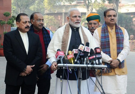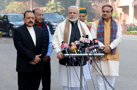 The Prime Minister, Narendra Modi delivering his statement to media ahead of the Budget Session of Parliament, in Parliament House, New Delhi on January 29, 2018. The Union Minister for Chemicals & Fertilizers and Parliamentary Affairs, Ananth Kumar, the Minister of State for Development of North Eastern Region (I/C), Prime Minister’s Office, Personnel, Public Grievances & Pensions, Atomic Energy and Space, Dr. Jitendra Singh, the Minister of State for Parliamentary Affairs and Statistics & Programme Implementation, Vijay Goel and the Minister of State for Parliamentary Affairs, Water Resources, River Development and Ganga Rejuvenation, Arjun Ram Meghwal are also seen.