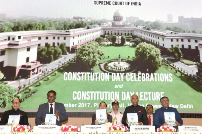 On the occasion of the Constitution Day inauguration ceremony organized by the Supreme Court to celebrate the anniversary of the constitution passed on November 26, 1949 in New Delhi on 26th November, 2017, by President Ramnath Kovind, the Chief Justice of India Deepak Mishra, 'Indian Judiciary Annual Report 2016-17, getting the first copy of On this occasion, Central Electronics and Information Technology and Law and Justice Minister Ravi Shankar Prasad and other dignitaries are also seen. The President, Ram Nath Kovind receiving the first copy of book 'Indian Judiciary: Annual Report 2016-17' from the Chief Justice of India, Justice . Dipak Mishra, at the inauguration of the Constitution Day celebrations, organized by the Supreme Court Mark the anniversary of the adoption of our Constitution on November 26, 1949, in New Delhi on November 26, 2017. The Union Minister for Electronics and Information Technology and Law and Justice, Ravi Shankar Prasad and other dignitaries also seen.