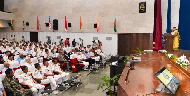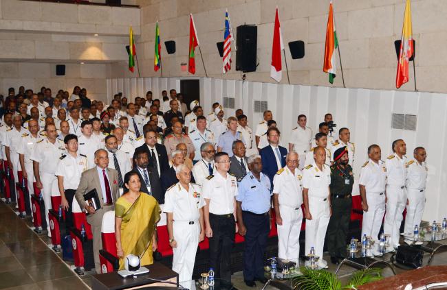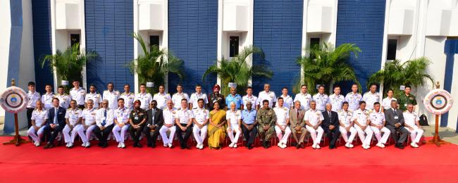 The Union Minister for Defence, Nirmala Sitharaman in a group photograph at the inauguration of the Goa Maritime Conclave, at Naval War College, in Goa on November 01, 2017. The Chief of Naval Staff, Admiral Sunil Lanba is also seen.