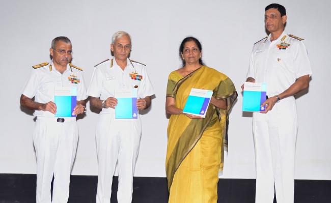 The Union Minister for Defence, Nirmala Sitharaman releasing the Naval War College Journal, at the inauguration of the Goa Maritime Conclave, at Naval War College, in Goa on November 01, 2017. The Chief of Naval Staff, Admiral Sunil Lanba is also seen.