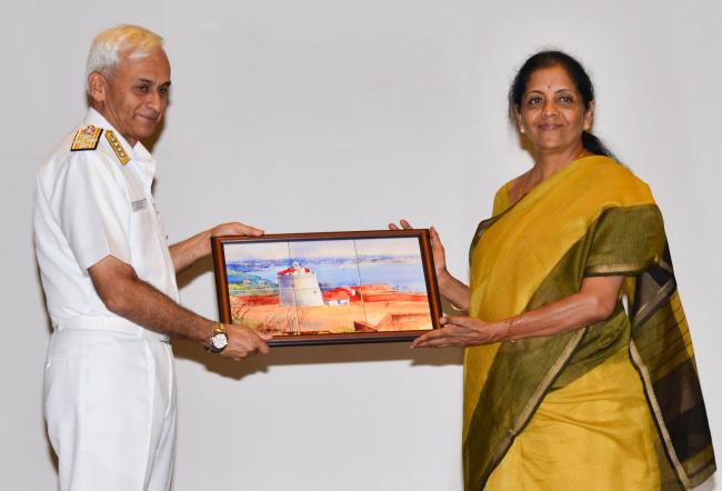 The Union Minister for Defence, Nirmala Sitharaman being presented a painting by the Chief of Naval Staff, Admiral Sunil Lanba at the inauguration of the Goa Maritime Conclave, at Naval War College, in Goa on November 01, 2017.