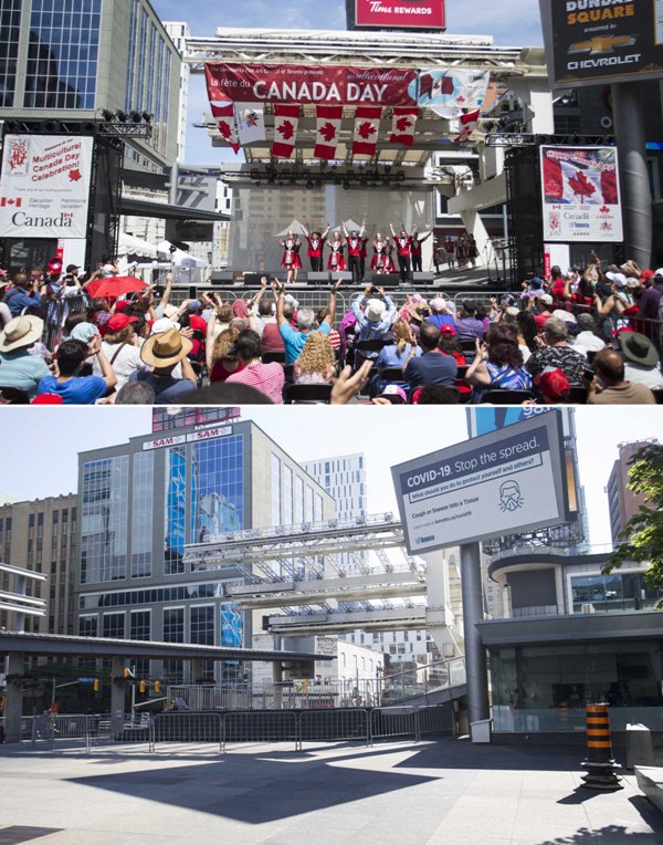 TORONTO, July 2, 2020 (Xinhua) -- Combo photo shows the Yonge-Dundas Square with a Canada Day celebration on July 1, 2019 (Top) and the almost-empty square on July 1, 2020 in Toronto, Canada. The City of Toronto on Wednesday cancelled all in-person Canada Day events due to the COVID-19 pandemic.
