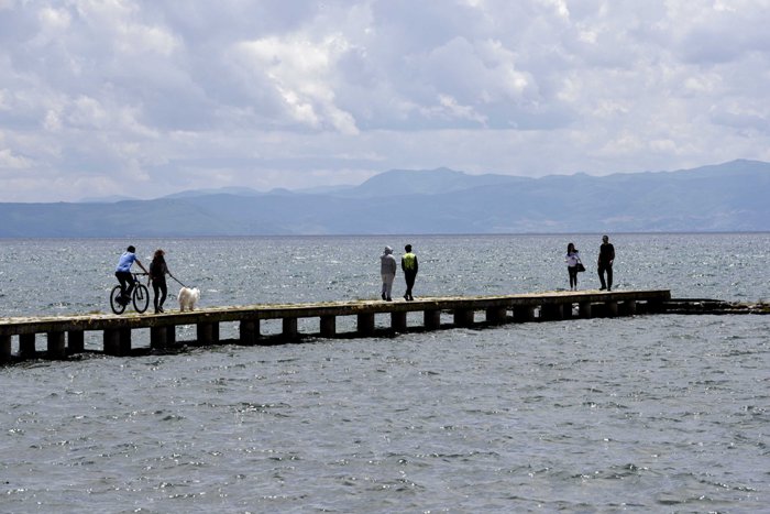 HRID, June 12, 2020 (Xinhua) -- Tourists visit Ohrid Lake in Ohrid, North Macedonia, June 11, 2020. North Macedonias Minister of Economy Kreshnik Bekteshi unveiled here on Monday a set of measures to support tourism as part of the third set of measures introduced by the government amid COVID-19 pandemic.