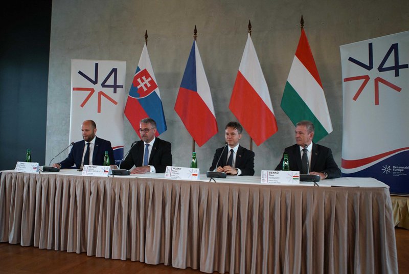 PRAGUE, June 25 (Xinhua) -- Slovak Defense Minister Jaroslav Nad, Czech Defense Minister Lubomir Metnar, Polish Deputy Defense Minister Pawel Wozny, and Hungarian Defense Minister Tibor Benko (from L to R) attend a press conference in Prague, the Czech Republic, on June 24, 2020. Defense ministers of Hungary, the Czech Republic, and Slovakia, and deputy defense minister of Poland, met here Wednesday to discuss mutual defense alliance before the handover of the groups presidency from the Czech Republic to Poland.