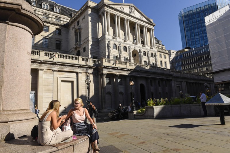 LONDON, Aug. 29, 2019 (Xinhua) -- People sit outside the Bank of England in London, Britain, Aug. 29, 2019. The British pound declined against the U.S. dollar and the euro on Wednesday in reaction to Prime Minister Boris Johnsons plan to suspend Parliament to reduce the MPs chances to pass laws to block a no-deal Brexit.