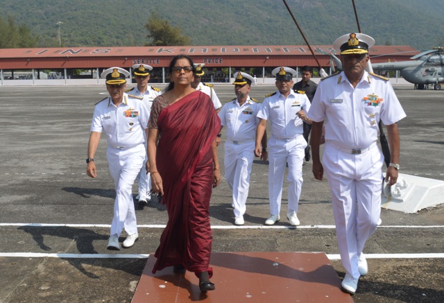 The Union Minister for Defence, Nirmala Sitharaman arriving at Karwar Naval Base, in Karnataka on December 28, 2017. The Chief of Naval Staff, Admiral Sunil Lanba is also seen.