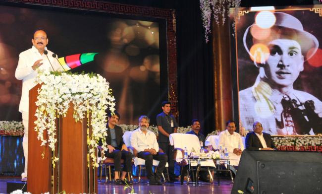 The Vice President,M.Venkaiah Naidu addressing the gathering after presenting the Akkineni Nageswara Rao National Film Award, in Hyderabad on September 17.2017.The Chief Minister of Telangana,Chandrashekar Rao, the Film Director,SSRajamouli and Film Actor,Akkineni Nagarjuna are also seen.