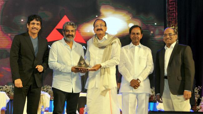 The Vice President,MVenkaiah Naidu presenting the Akkineni Nageswara Rao National Film Award to the Film Director,SS.Rajamouli, in Hyderabad on September 17.2017. The Chief Minister of Telangana,Chandrashekar Rao, Film Actor,Akkineni Nagarjuna and other dignitaries are also seen.
