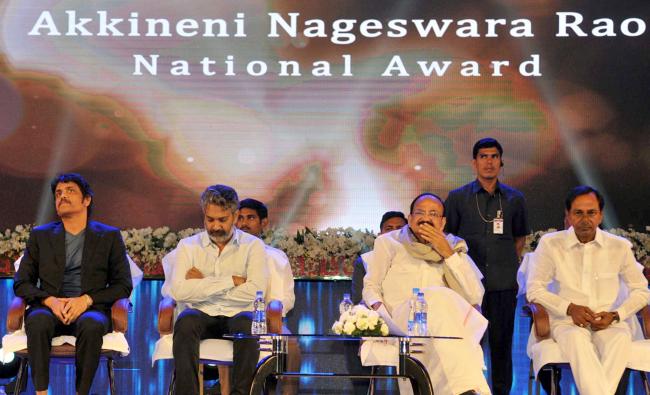 The Vice President,M.Venkaiah Naidu at an event to present Akkineni Nageswara Rao National Film Award, in Hyderabad on September 17.2017. The Chief Minister of Telangana,Chandrashekar Rao, the Film Director,SSRajamouli and Film ActorAkkineni Nagarjuna are also seen.