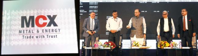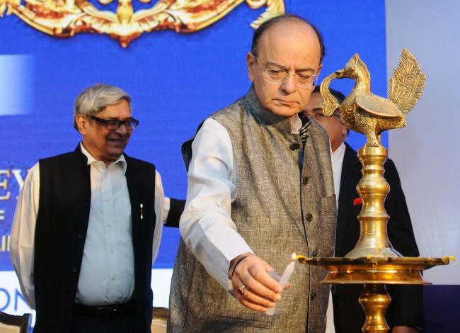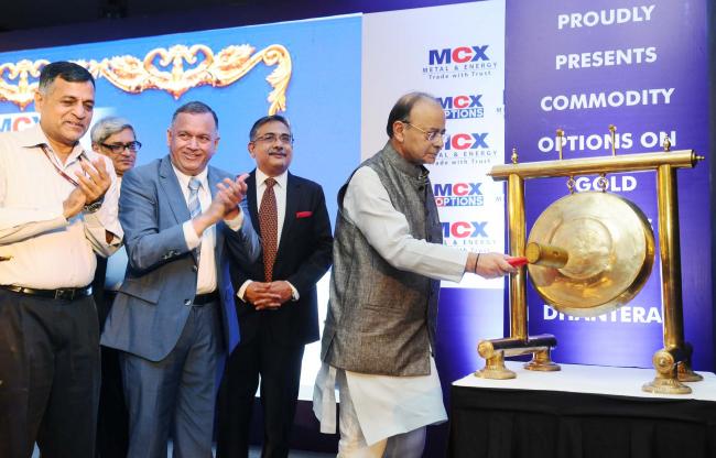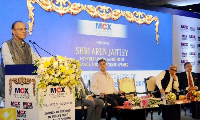 The Union Minister for Finance and Corporate Affairs, Arun Jaitley addressing at the launch of the commodity options on gold futures, in New Delhi on October 17, 2017. The Chairman, Economic Advisory Council to the Prime Minister, EAC-PM, Dr. Bibek Debroy and the Finance Secretary, Ashok Lavasa are also seen.