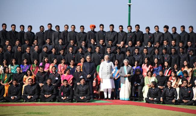 The Prime Minister, Narendra Modi in a group photograph with the Officer Trainees of the 92nd Foundation Course, at the Lal Bahadur Shastri National Academy of Administration (LBSNAA), in Mussoorie, Uttarakhand on October 26, 2017.
