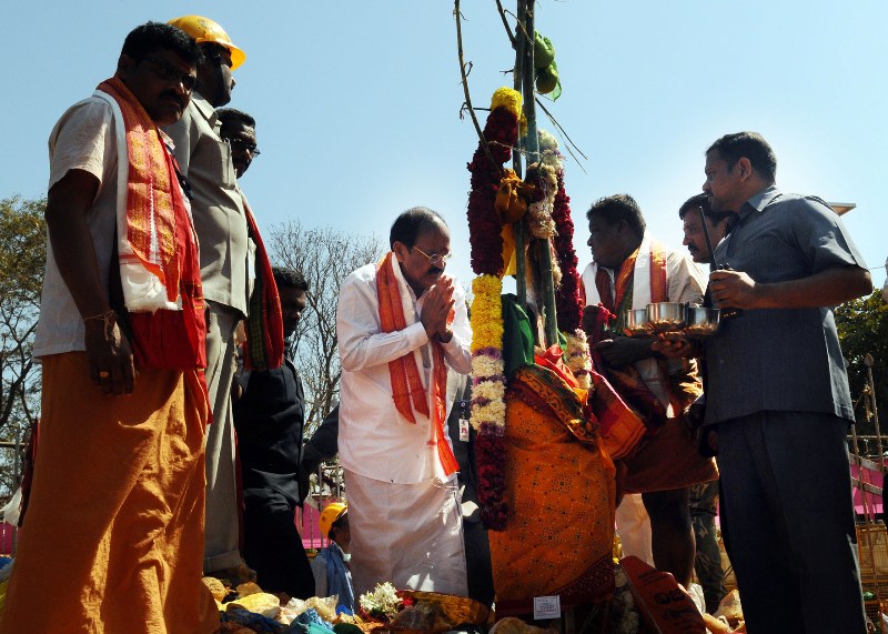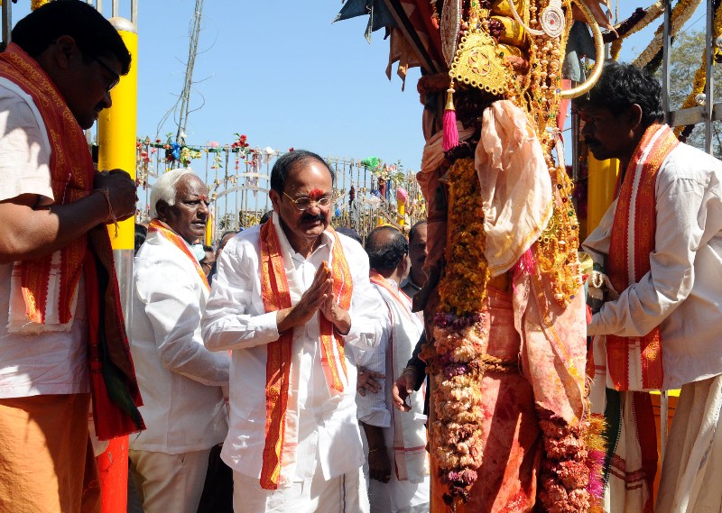 The Vice President, M. Venkaiah Naidu offering prayers to the Saralamma deity, in Medaram village, Telangana on February 02, 2018.